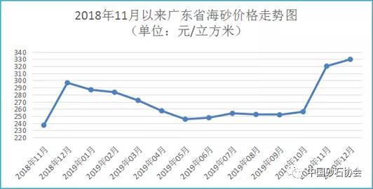 據(jù)中國砂石協(xié)會和中國砂石骨料了解,砂石價格2019年最低點出現(xiàn)在5月份,河砂和海砂全省購進價分別為每立方米207元和246元,隨后震蕩回升,年底上漲到全年最高點,12月份河砂和海砂購進價分別達到每立方米265元和330元,同比(與2018年12月比,下同)分別上升14.92%和11.06%。