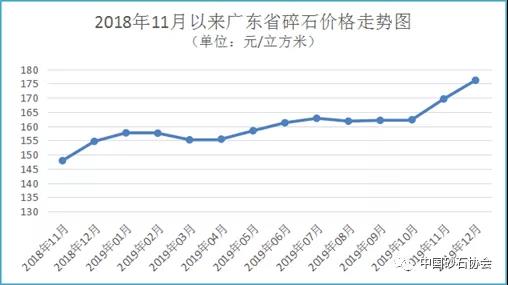 碎石價格在2019年持續(xù)震蕩上升,全年均價為每立方米162元,全年最高價出現(xiàn)在12月份。其中,12月份全省購進價達到每立方米176元,同比上升13.91%。