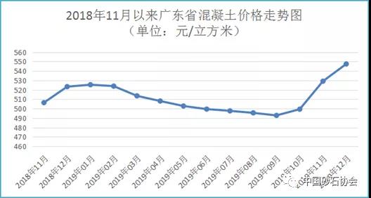 (三)混凝土價格呈“V”型走勢。2019年廣東省混凝土價格高位窄幅回落后,10月份開始持續(xù)快速向上反彈,總體呈“V”型走勢,年底價格反超年初最高點。其中,12月份混凝土全省批發(fā)價達到每立方米547元,同比上升4.6%。
