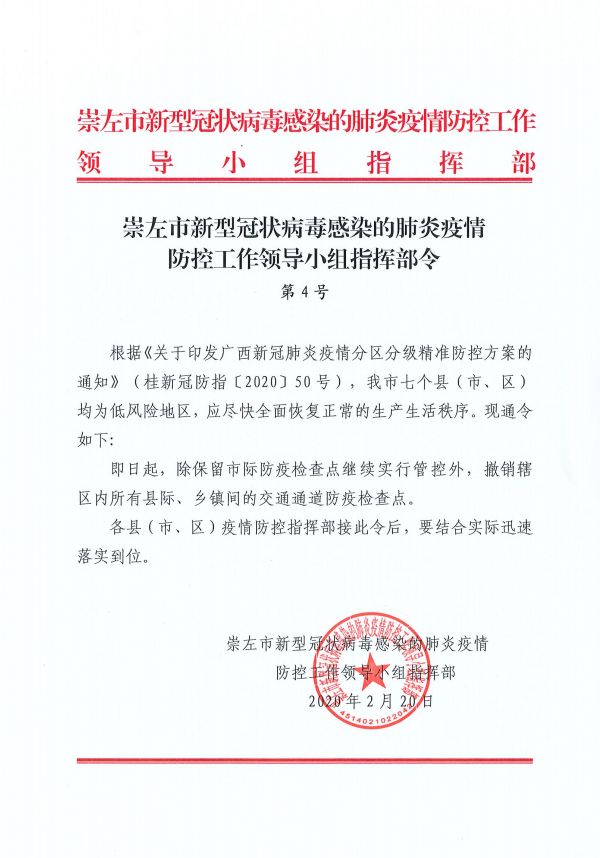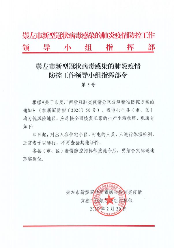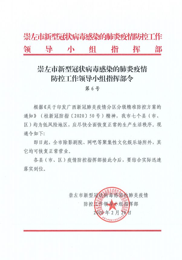 崇左市新型冠狀病毒感染的肺炎疫情防控工作領導小組指揮部令第6號