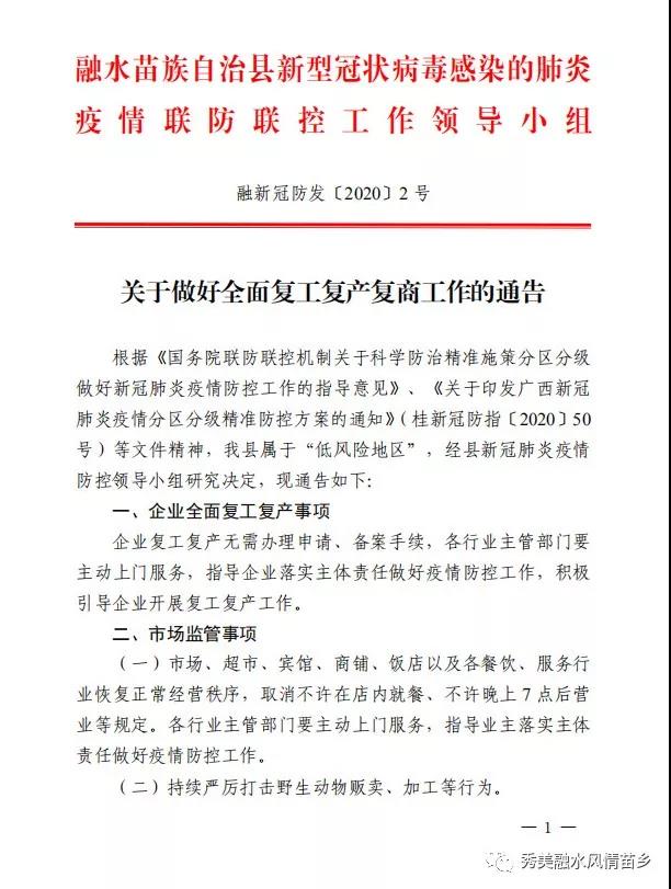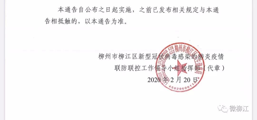 為貫徹上級(jí)關(guān)于復(fù)工復(fù)產(chǎn)復(fù)商等文件精神,柳城縣鼓勵(lì)各類可開放行業(yè)積極復(fù)工復(fù)產(chǎn)復(fù)商。同時(shí),各主管部門要主動(dòng)做好服務(wù)工作,指導(dǎo)做好疫情防控工作。本通告自公布之日起實(shí)施,之前已發(fā)布相關(guān)規(guī)定與本通告相抵觸的,以本通告為準(zhǔn)。 柳城縣新型冠狀病毒感染的肺炎疫情聯(lián)防聯(lián)控工作領(lǐng)導(dǎo)小組指揮部2020年2 月 20 日