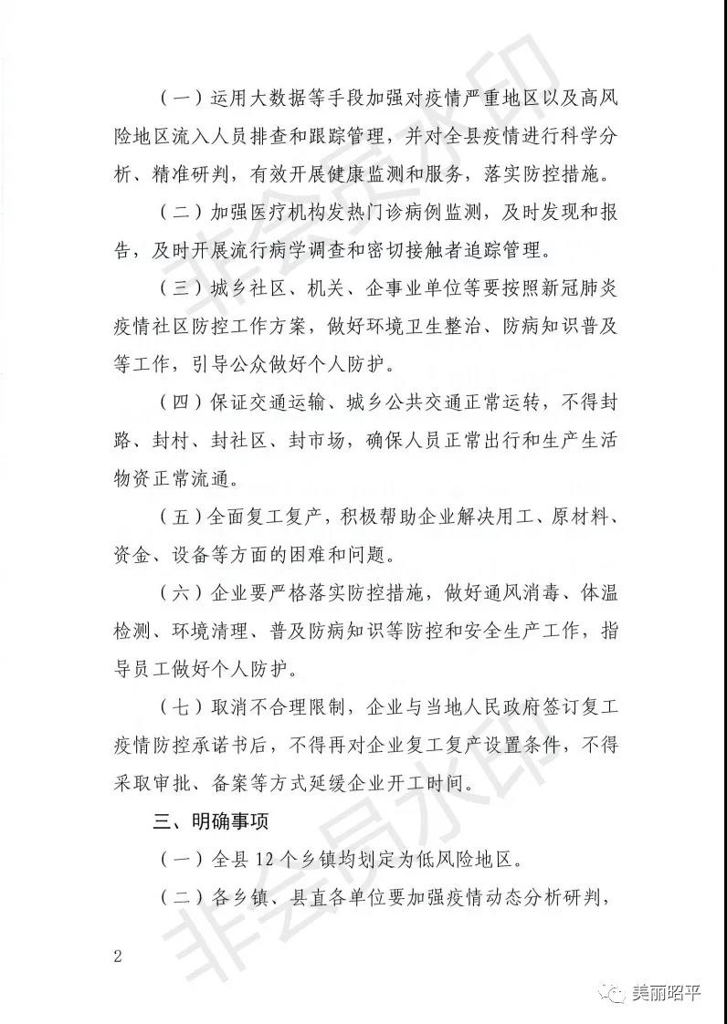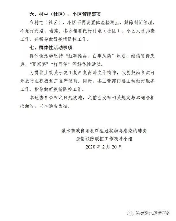 二、保障人民群眾工作、生產(chǎn)生活正常出行。放寬居民出行條件,取消“每個(gè)家庭每?jī)商炫梢蝗瞬少?gòu)生活必需品”的要求,廣大居民可在縣內(nèi)自由通行,任何單位或個(gè)人不得阻攔。