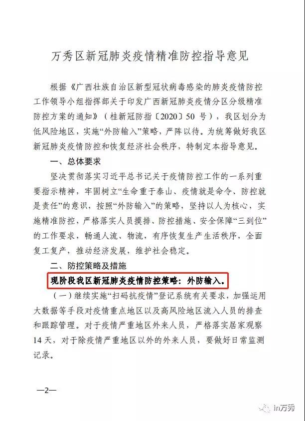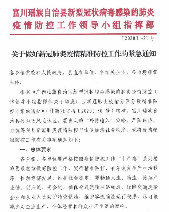 為全面貫徹落實(shí)廣西壯族自治區(qū)新型冠狀病毒感染的肺炎疫情防控工作領(lǐng)導(dǎo)小組指揮部《關(guān)于印發(fā)廣西新冠肺炎疫情分區(qū)分級(jí)精準(zhǔn)防控方案的通知》(桂新冠防指〔2020〕50號(hào))精神,統(tǒng)籌做好新冠肺炎疫情防控,恢復(fù)經(jīng)濟(jì)社會(huì)秩序,經(jīng)縣新冠肺炎疫情聯(lián)防聯(lián)控工作領(lǐng)導(dǎo)小組指揮部研究決定,實(shí)施“外防輸入”的防控策略,嚴(yán)陣以待,確保全縣正常生活生產(chǎn)秩序?,F(xiàn)將疫情防控期間相關(guān)事項(xiàng)通告如下: