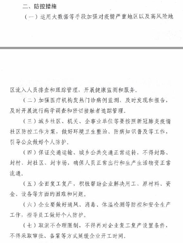 四、保證交通運(yùn)輸、城鄉(xiāng)公共交通正常運(yùn)轉(zhuǎn),不得封路、封村、封社區(qū)、封市場(chǎng),確保人員正常出行和生產(chǎn)生活物資正常流通。 五、全面復(fù)工復(fù)產(chǎn),積極幫助企業(yè)解決用工、原材料、資金、設(shè)備等方面的困難和問題。